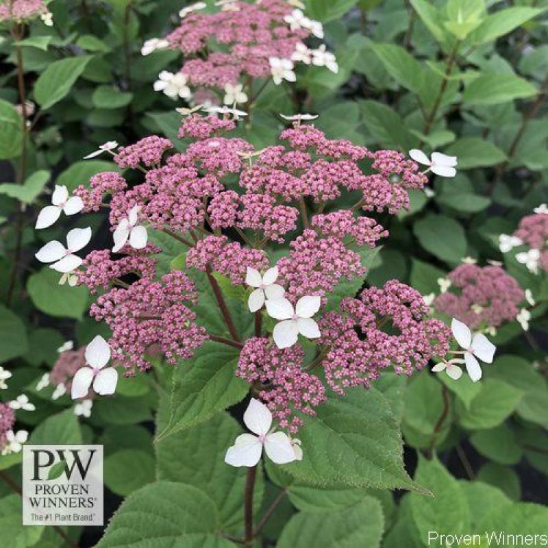 (Smooth Hydrangea) gorgeous plum-purple lacecap flowers with dark ruby hued stems; the graceful habit fits in perfectly with gardens where the style is loose and informal. Best in part shade. Grows 4-5 feet tall and wide and is hardy to Zone 3.