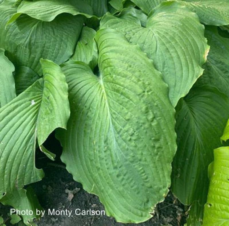 'Mint Rushmore' boasts very large, rounded green leaves that are moderately corrugated with rippled margins. Near white flowers with pale lavender interior stripes bloom in early summer. Grows 27 inches tall by 68 inches wide.