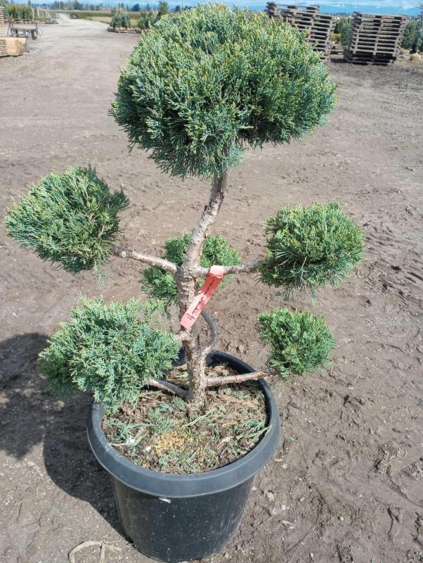 The poodled form of Juniperus chinensis 'Hetzii Glauca' is a cultivated variety characterized by a rounded growth habit resembling a poodle's grooming style. This ornamental shrub features dense, silvery-blue foliage that maintains its vibrant color year-round. Meticulously shaped for a compact and well-manicured appearance, it adds whimsy and artistic appeal to gardens. Its versatility makes it an excellent choice for both structure and charm in various garden settings. Pruning is necessary to maintain desired shape and size. 'Hetzii Glauca' is best in full sun and is hardy to Zone 4.