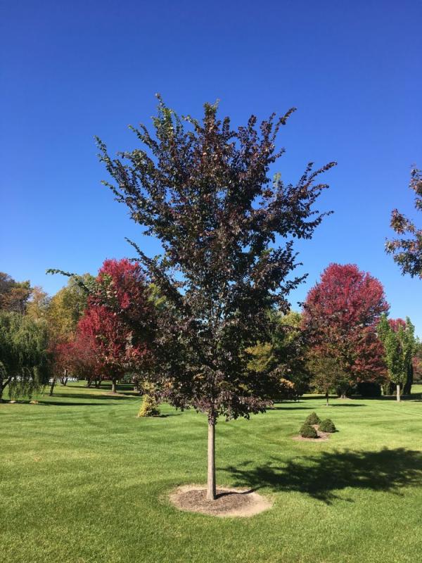 'Frontier' features beautiful reddish-purple to burgundy fall color which is particularly long lasting. This hybrid is resistant to Dutch Elm Disease, forming a vase-shaped to oval crown. The foliage is glossy green in summer. Grows 40' tall and 30' wide. Hardy to Zone 4.