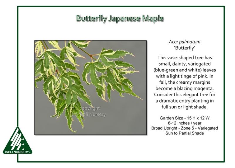 Its soft, variegated leaves seem to flutter like butterfly wings in the breeze. ‘Butterfly’ adds light, texture, and gentle color to the garden—perfect for collectors or anyone wanting a unique, eye-catching Japanese maple.