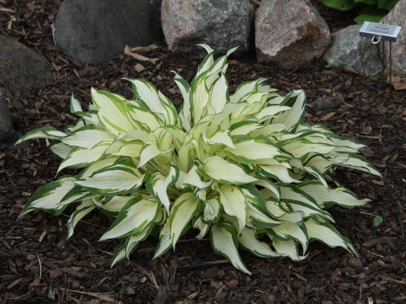 A larger sport of 'White Christmas'. The white-centered leaves have narrow, dark green margins and lighter green sandwiched in between. Like 'White Christmas', it needs some morning light or lots of filtered light to grow well. It can grow to 20" tall and 55" wide in ideal conditions. Lavender flowers in summer.