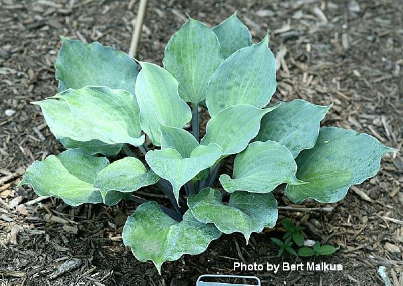 From Bob Solberg comes this seedling of 'Plum Pudding'. Intensely colored blue leaves are ruffled and held on plum-red petioles. Grows 16” tall by 24” wide and produces purple flowers in late summer.