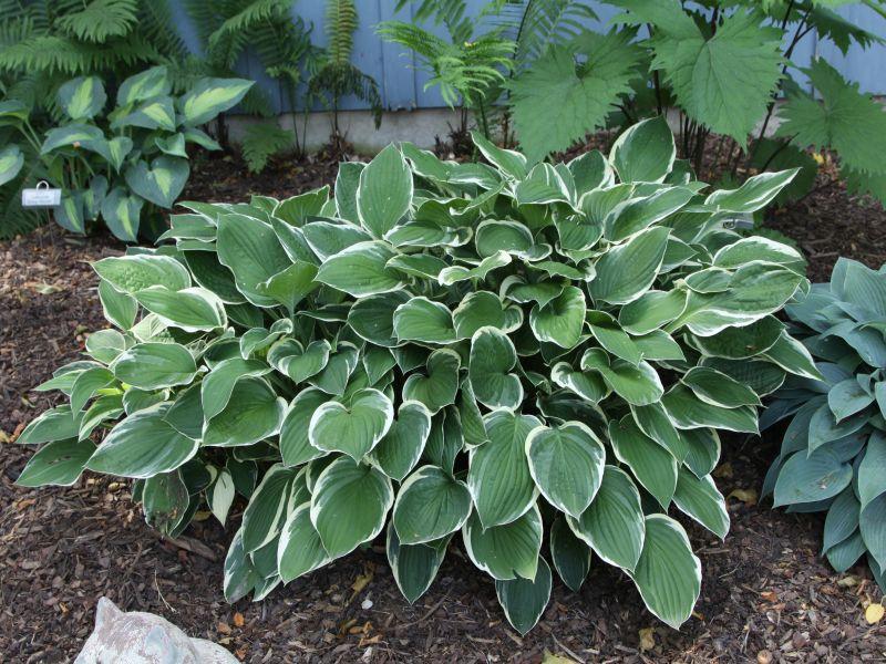The dark green leaves and creamy white margins of ‘Carol’ make for a very attractive clump. She’s a reliable performer and fairly sun tolerant. Similar to ‘Francee’, but with smaller leaves. Grows 20” tall and 36” wide. Lavender flowers in summer.