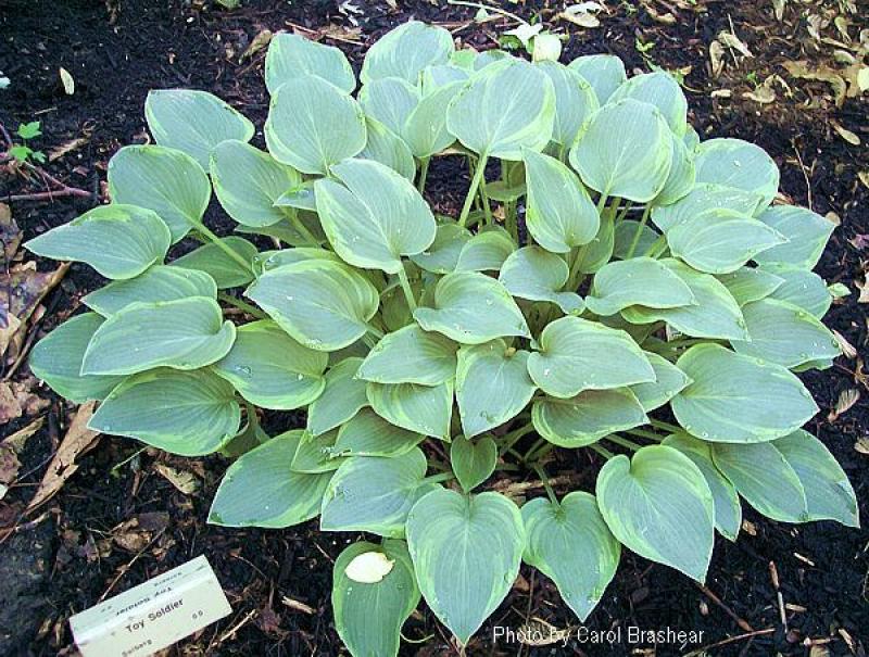 An excellent sport of 'Blue Cadet' with the same nice growth habit and leaf shape, but with the addition of a cream edge. The leaves emerge with subtle gold margins which lighten as the season progresses, depending on how much light the clump gets. Grows 10" tall and 24" wide. Lavender flowers in summer.