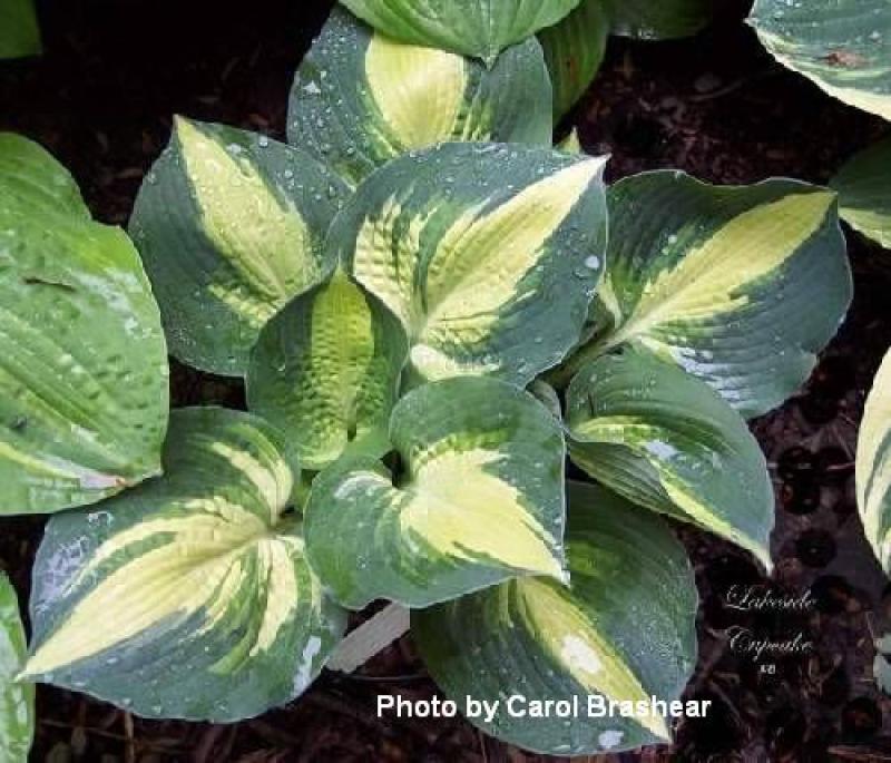 This cute and showy hosta forms an outstanding small clump. The leaves emerge with gold centers and deep blue-green borders. The centers turn quickly to white. Grows 10" tall and 15" wide. A choice hosta. Lavender flowers in summer.