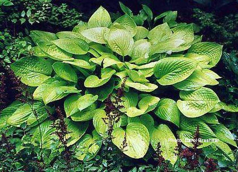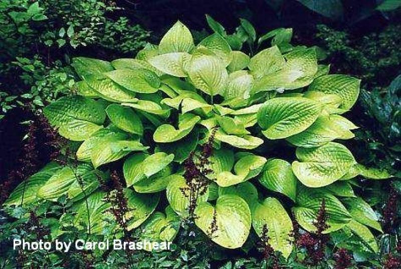 An attractive yellow clump with heart shaped leaves, especially bright in the spring. The leaves are held on dark petioles. The very dark flower scapes have a purple streak. The dark petioles and flower scapes apparently give the plant its name. Grows 10” tall and 16” or more wide. Lavender flowers in mid summer.