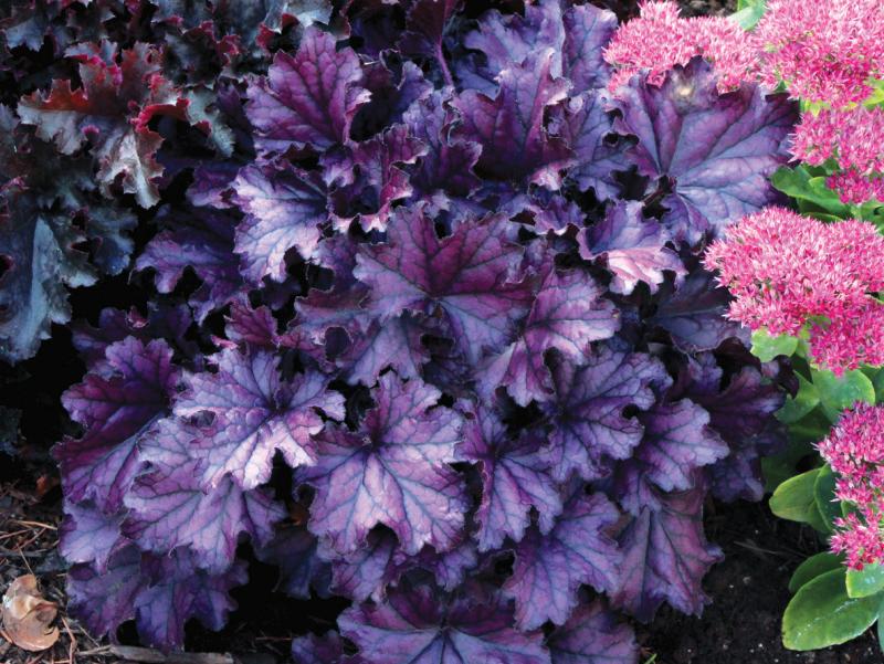 'Forever Purple' has glossy, intensely purple leaves with fluted edges all season long. Fairly short spikes of purple-pink flowers in summer, only 15" tall. The mound of foliage grows 12" tall x 22" spread. Heuchera can grow anywhere from sun to shade, but seem to do best with some afternoon shade or filtered sun. Hardy to Zone 4.