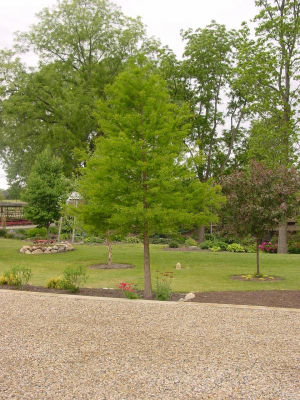 If you're interested in something narrower, Shawnee Brave™ is a cultivar that is denser and only gets 15-20' wide.  Lindsey's Skyward® produces no surface roots or knees and only gets 5-10' wide, making for a soft, unique vertical accent.