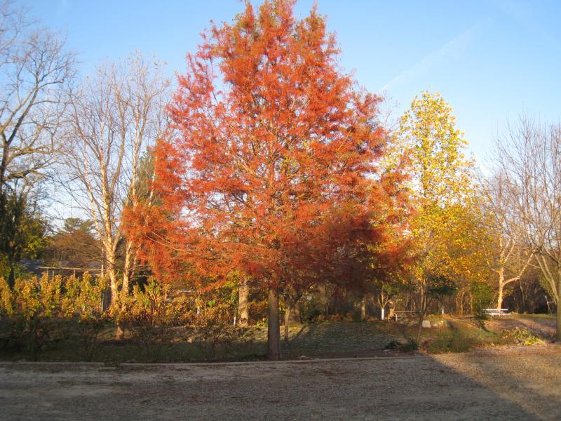 We have several Bald Cypress planted here at our arboretum that range from 5 to 35 years old. If you decide to make the trip out here, be sure to check out the one planted next to the bridge in the Hosta Ravine. There is a natural spring coming out of the hillside that feeds the pond down below. Because of the constant moisture, the 25 year old tree has developed lots of knees, which get covered up by massive clumps of Ligularia japonica by Spring's end. I make sure to cut the Ligularia back in late Summer after its blooms are spent, allowing the knees to show off. Most recently, we planted 8 Bald Cypress in our parking lot at the garden center that are spaced 30' apart. The idea being that they will eventually offer filtered shade across the majority of graveled area that is the parking lot and pottery section. They handle heavy compacted soils well, which makes it a great fit for the hard packed gravel and clay. The pictures provided here show one of our trees in 2005, 2010 and 2022. 2005 was taken in the Spring, 2010 in the Fall and 2022 in the Winter. This tree was the first Bald Cypress planted on our grounds over 25 years ago. It now towers over the 8 newly planted babies.