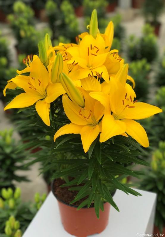 (Asiatic Lily) large, bright yellow flowers; 14 inches; full to part sun; Zone 3