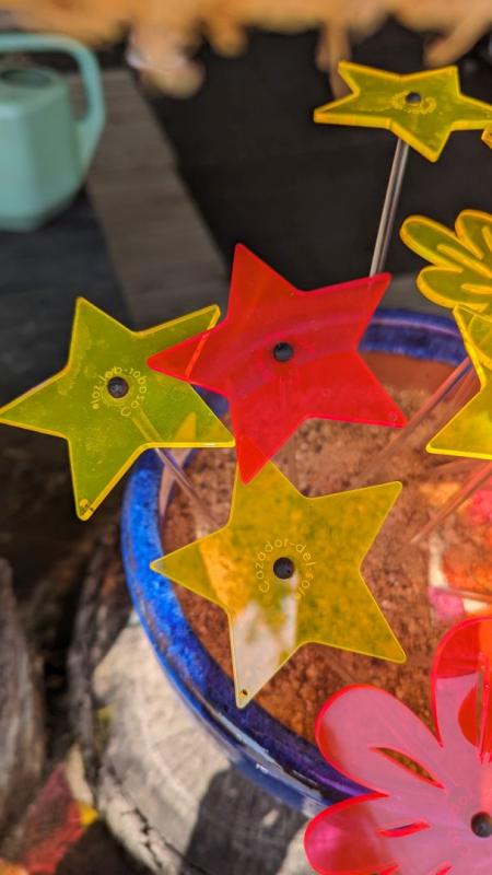 Flat, red, star-shaped suncatcher. 3.2" flower on a 10" clear stem.