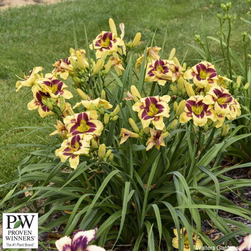 Uniquely shaped, triangular pale yellow petals have a large wine purple eye and a razor thin wine purple edge. A midseason bloomer (July) and a rebloomer, meaning it will produce a second set of flowers.