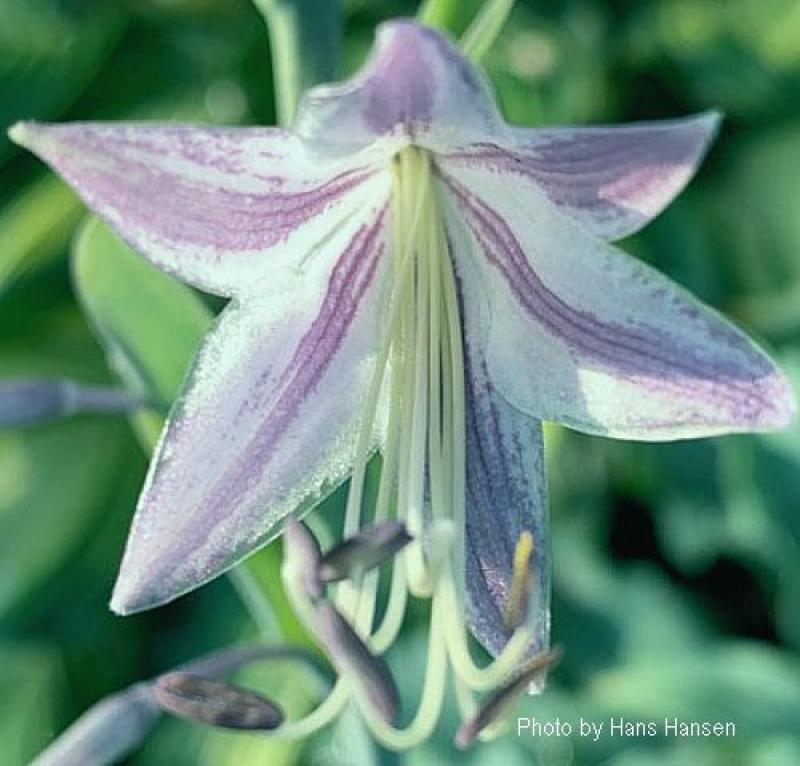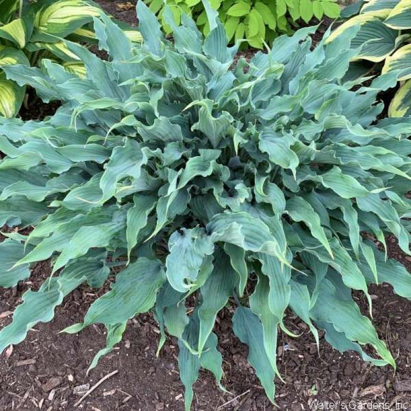 This wild looking blue Hosta creates a sizeable mound of narrow twisted and ruffled leaves. Exceptionally large plant for a strap-leaf Hosta. Compared with recent new introduction 'Silly String', this plant is more than twice the size. Grows 22" tall and 50" wide. Lavender flowers in mid summer.