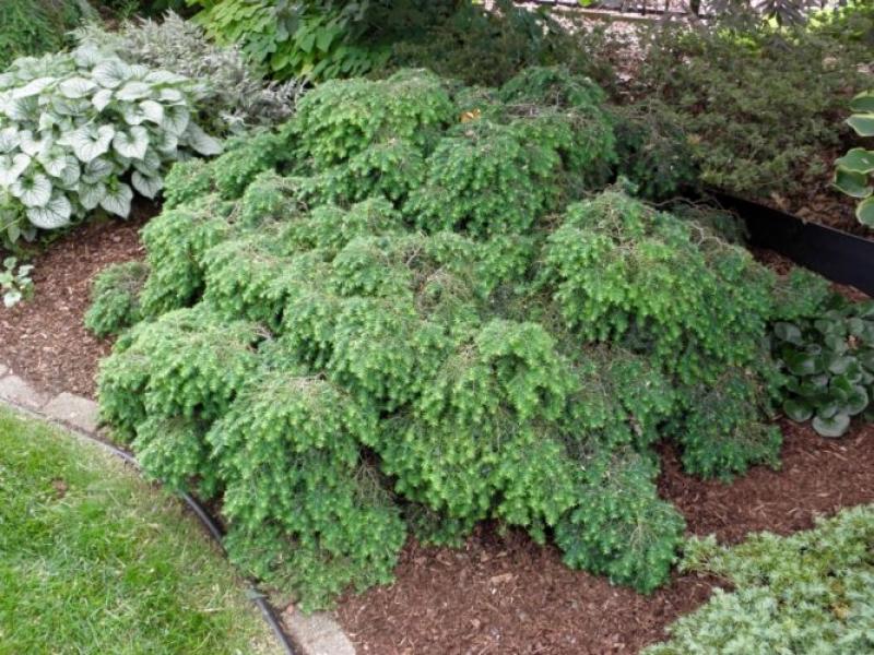 A dwarf, spreading mound, often referred to as Bird's Nest Hemlock, this seedling cultivar has a unique, depressed, funnel shape at its center. The slow-growing plant has bright green foliage with feathery, arching tips. Grows in full sun to partial shade to 2' tall and 4' wide in 10 years. Hardy to Zone 4.