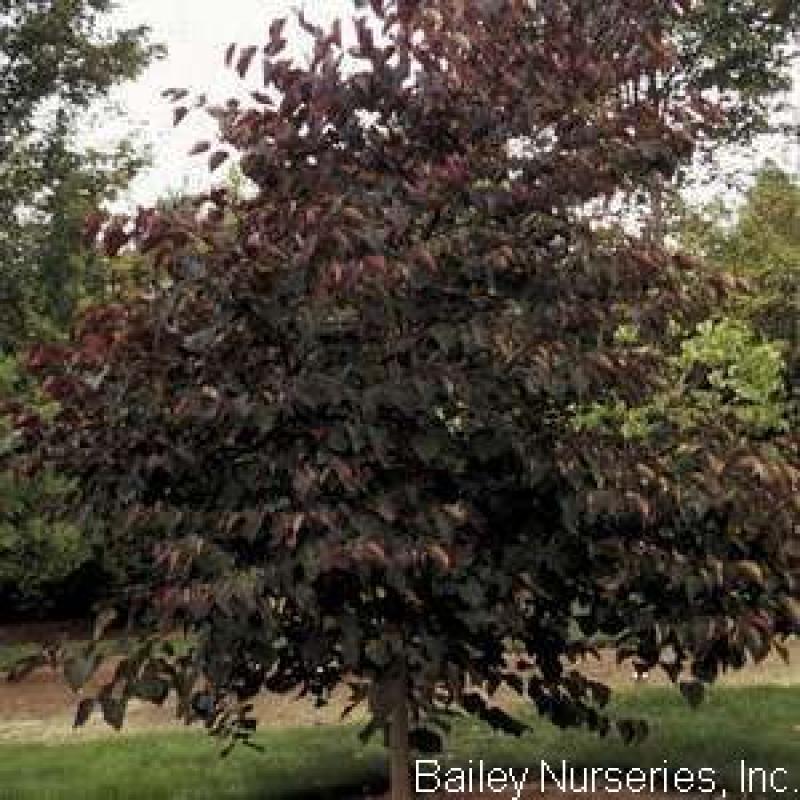 A Redbud with deep purple foliage and magenta rose flowers on an ornamental tree. The flowers bloom on bare branches before the leaves emerge. Foliage holds its color best in part shade, and turns yellow-orange in fall. Grows 20' tall and wide, and is hardy to Zone 5.