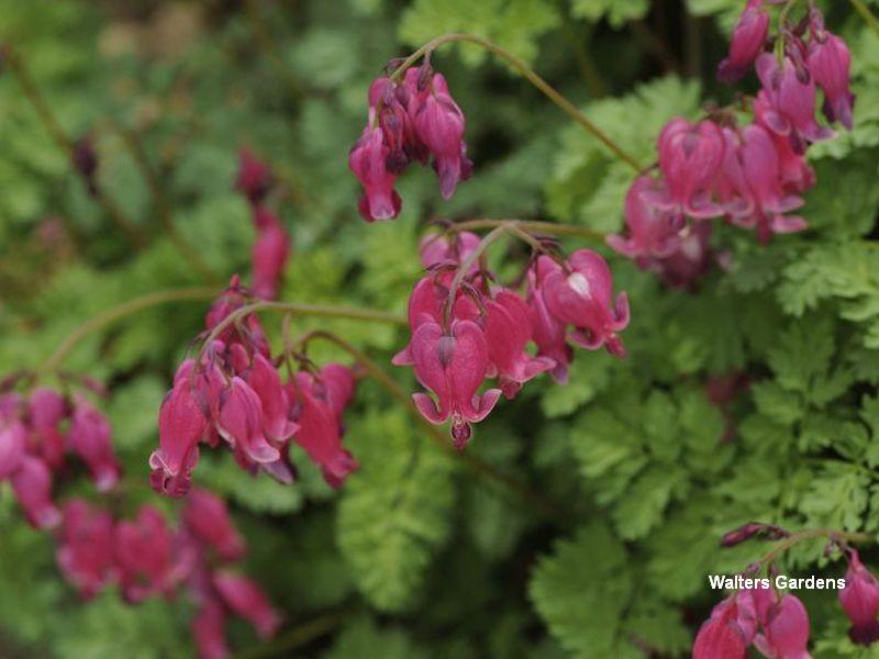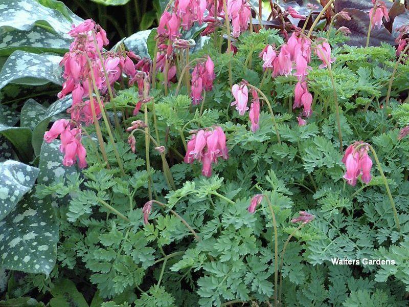 (Bleeding Heart) a hybrid form with lovely, finely cut, soft grayish green foliage and rosy pink, heart-shaped flowers; blooms all summer long; part shade; 8-10 inches; Zone 5