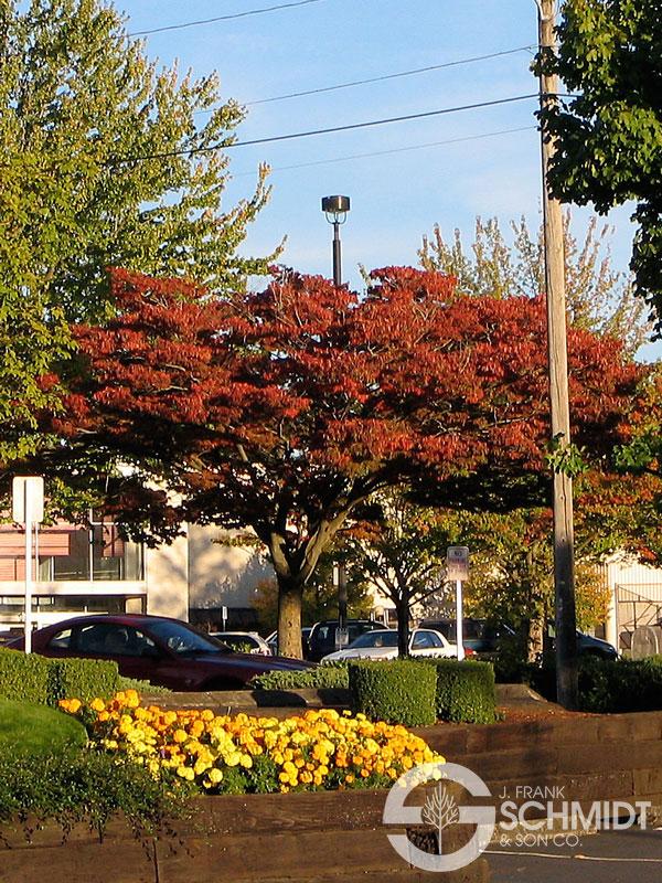 Selected for its unusually low height and broad, horizontally spreading growth habit, its vivid red fall color is a surprisingly bright bonus feature. As its name suggests, this cultivar is a good fit for street plantings beneath utility lines. Like the species, it is a trustworthy performer in urban settings. Grows 24' tall and 36' wide and prefers full sun. Hardy to Zone 5.