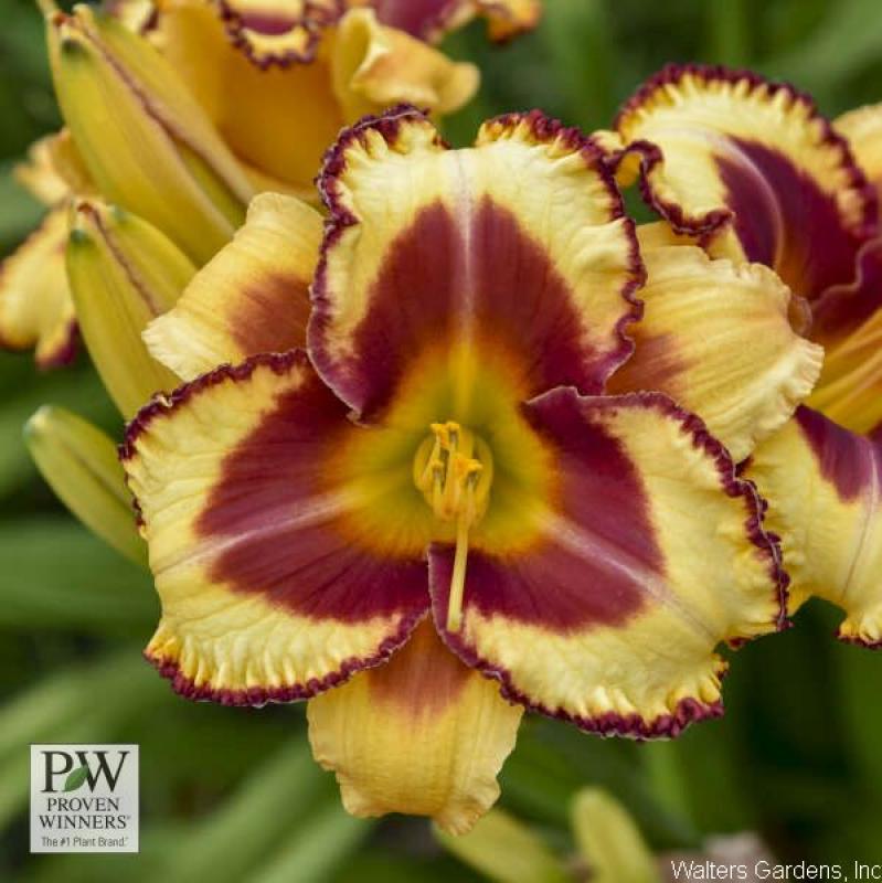 (Emmerich, 2019) 32 inches-M-SEV-TET-FR-RE-5 inches; yellow orange with a bold burgundy red eye and matching picotee edge