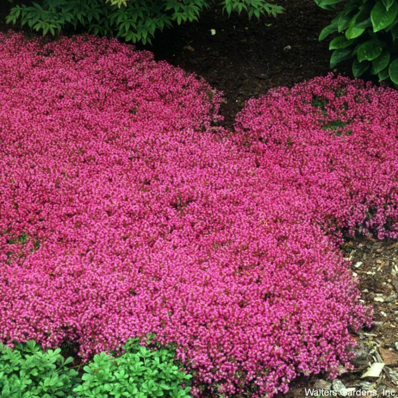 (Creeping Thyme) deep pink flowers clustered on top of blue-green, aromatic foliage; great ground cover or filler; 3 inches tall; Zone 3