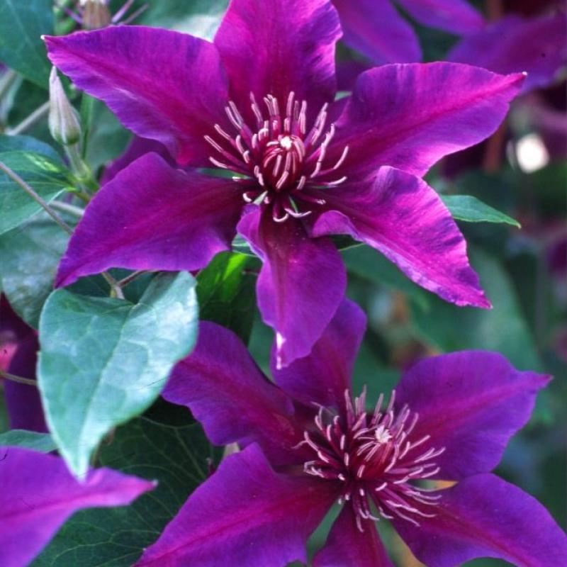 5-inch deep purple flowers with contrasting center bloom May-August; compact size grows well in containers; 4 feet tall; partial shade; pruning group 2