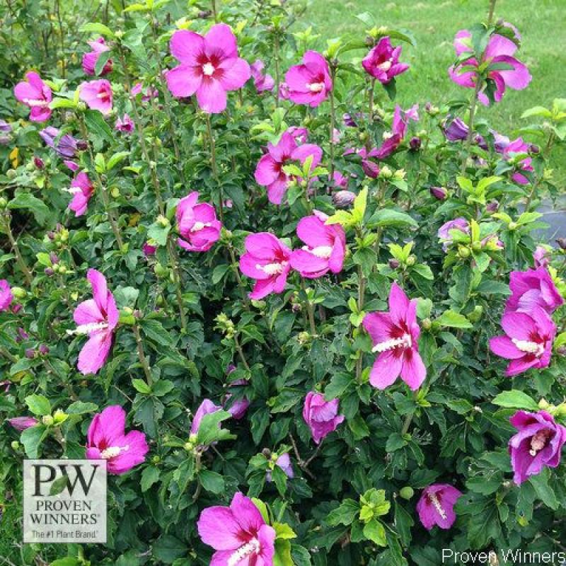 Hibiscus Lil' KimĀ® Violet has vivid plum-violet flowers all summer long. These 3-inch wide flowers are accented by a red eye and glossy, dark green foliage. Like other varieties in the Lil' KimĀ® series, this rose of Sharon is great for small gardens or containers with a compact habit and strong stems. Trim in late winter or early spring if desired. This shrub grows 3-4 ft tall and wide in full sun and is hardy to Zone 5.