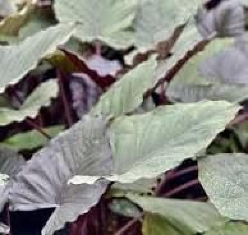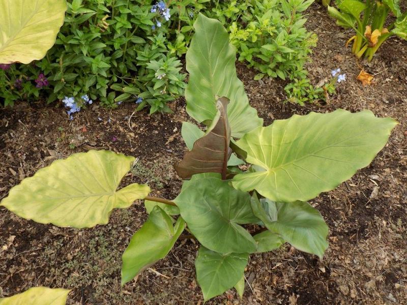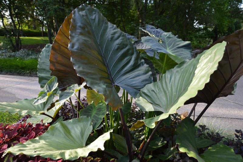 (Elephant Ear) large, glossy, dark green leaves with purple undersides; 3-4' tall; great for containers; full to part sun; Zone 9