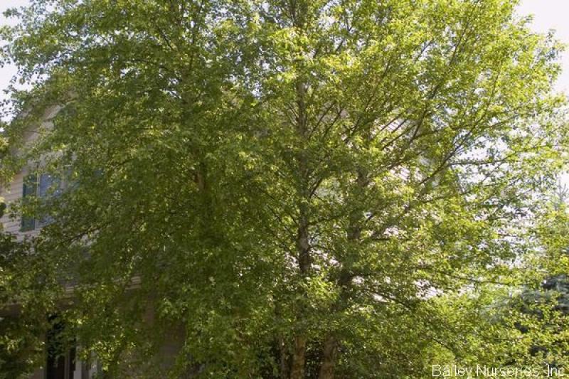 A selection of river birch with light green, glossy foliage, turning yellow in fall. Wonderful, exfoliating bark is light tan, peeling to expose mottled patches of cream, orange and pinkish tan colors. Grows in full sun, 40' tall and 30' wide. Hardy to Zone 4. As a mature tree, the river birch tends to drop quite a few small twigs and branches during wind storms, so it may be best planted out in the lawn where the mower can chop up the bulk of the fallen twigs.