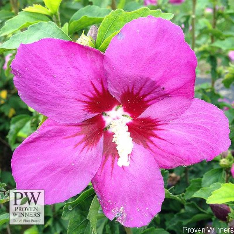 Hibiscus Lil' KimĀ® Violet has vivid plum-violet flowers all summer long. These 3-inch wide flowers are accented by a red eye and glossy, dark green foliage. Like other varieties in the Lil' KimĀ® series, this rose of Sharon is great for small gardens or containers with a compact habit and strong stems. Trim in late winter or early spring if desired. This shrub grows 3-4 ft tall and wide in full sun and is hardy to Zone 5.