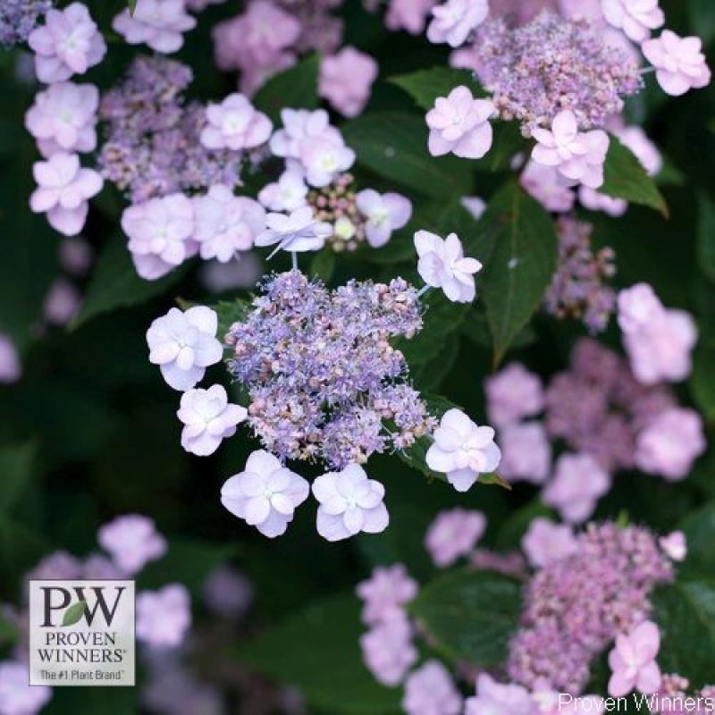 Tiny Tuff Stuff™ is a real beauty, with flowers so delicate and refined that it seems strange to call them tough - but they are. It is extremely bud-hardy, each year it produces abundant lacecap flowers comprised of doubled sepals. The first flush of blooms is on old wood, then it reblooms on new wood each season! While this plant leans to blue, the flower color may range from blue to pink to white, all soft, delicate shades perfect for refined gardens. The flowers age to an attractive pink, and tip down in a distinctive arching fashion. Aluminum sulfate added to the soil can encourage blue flower color. Powerful display in a petite package, Tiny Tuff Stuff™ grows to around 2' tall in part sun and is hardy to Zone 5.