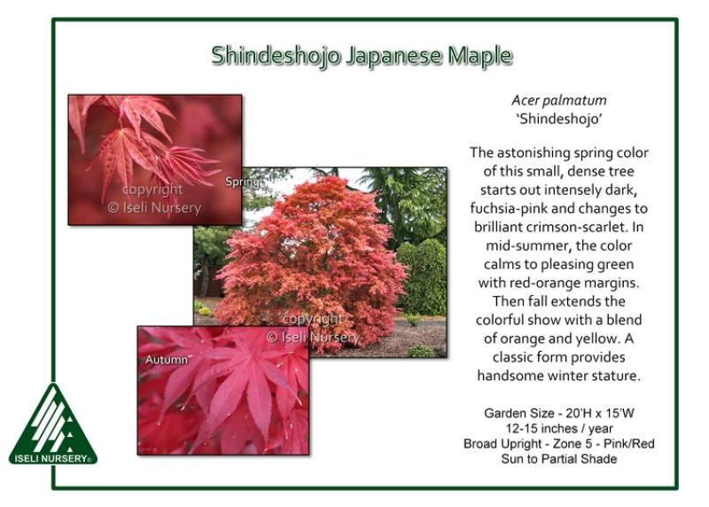 A gorgeous, medium-sized variety of Japanese Maple, growing to around 8' tall and 10' wide at maturity. It has the most brilliant red spring color, which lasts well into summer. Foliage gradually turns green and then exhibits orange and red fall colors. Best in part shade. Hardy to Zone 5.