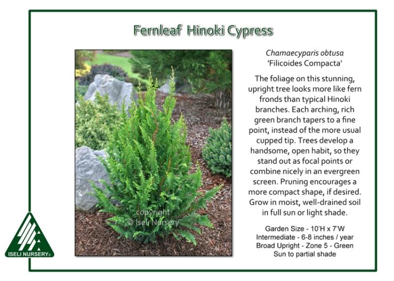 The foliage on this stunning, upright tree looks more like fern fronds than typical Hinoki branches. Each arching, rich green branch tapers to a fine point, instead of the more usual cupped tip. Trees develop a handsome, open habit, so they stand out as focal points. Pruning encourages a more compact shape, if desired. Grow in moist, well-drained soil in light shade or afternoon shade. Garden size is listed as 10' tall and 7' wide. Hardy to Zone 5