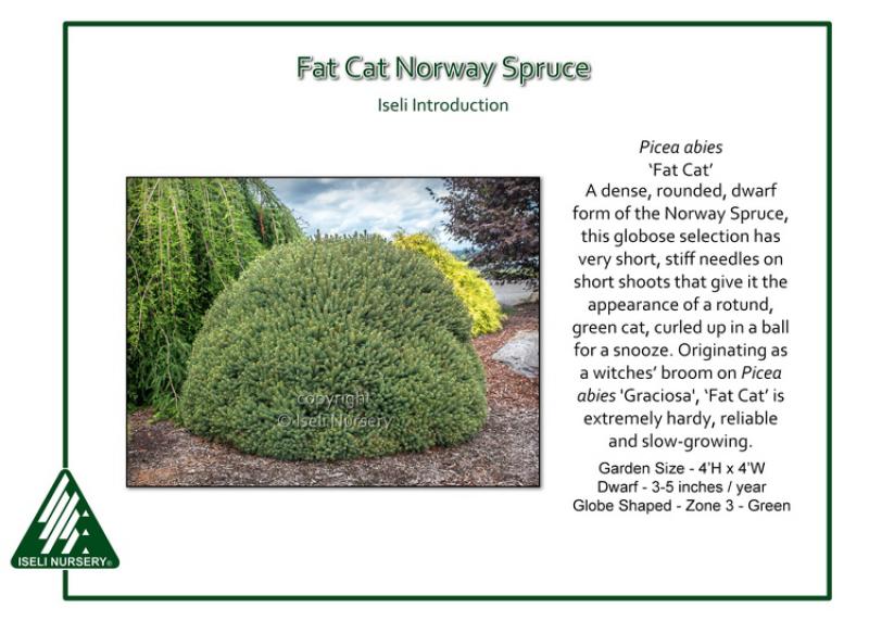 Picea abies ‘Fat Cat’ has very short, stiff needles and short shoots that give it the appearance of a rotund, green cat, curled up in a ball for a snooze. Iseli Nursery acquired the plant, a witch’s broom from Picea abies ‘Graciosa’, in 1994 and officially named it for a tubby, slumbering feline. Extremely hardy, reliable and slow-growing, this kitty creates a presence in the landscape, but don’t try to pet its “fur”. Sun to part shade. Garden size is 4' tall and wide. Hardy to Zone 3.