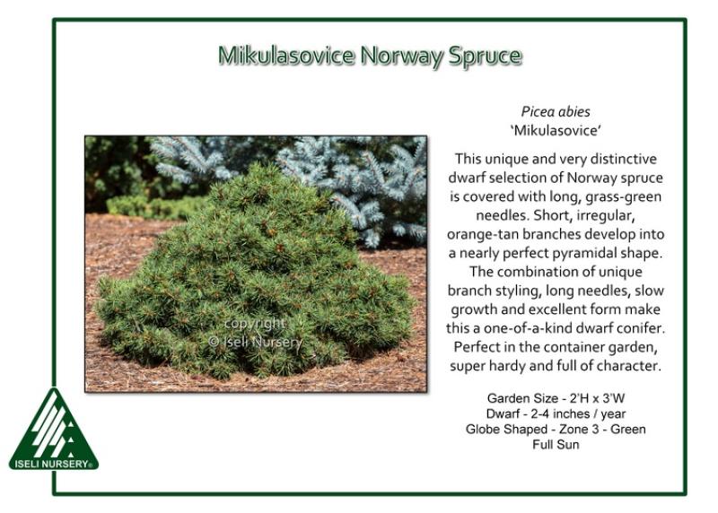 The unique and very distinctive dwarf conifer, Picea abies ‘Mikulasovice’ is covered with long, grass-green needles. Short, irregular, orange-tan branches develop into a nearly perfect pyramidal shape. The combination of unique branch styling, long needles, slow growth and excellent form make this a one-of-a-kind dwarf conifer. Perfect in the container garden, super hardy and full of character. Full sun to part shade. Hardy to Zone 3