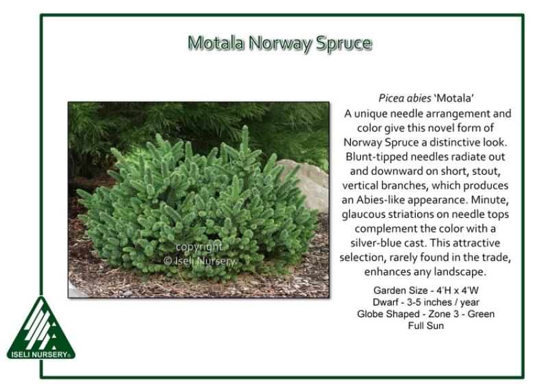A unique needle arrangement and color give Picea abies ‘Motala’ a distinctive look. Blunt-tipped needles radiate out and downward on short, stout, vertical branches, which produces an Abies-like appearance. Minute, glaucous striations on needle tops complement the color with a silver-blue cast. This attractive selection, rarely found in the trade, enhances any landscape. Sun to part shade. Garden size is 4' tall and wide. Hardy to Zone 3