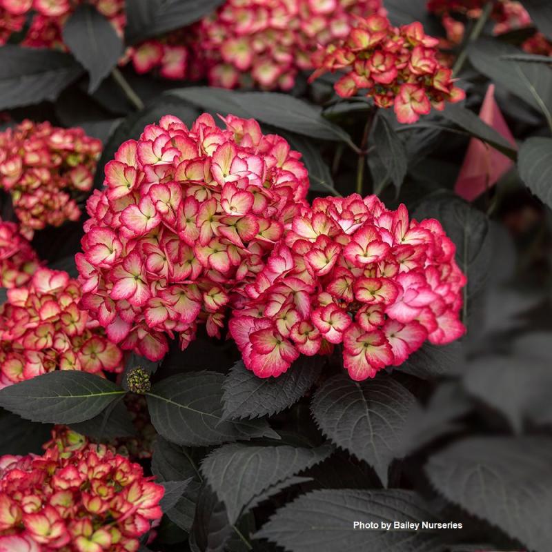 This Bigleaf Hydrangea stands out with near-black, dark purple foliage. Not only is the foliage dark, but it also holds the color all season, and has exceptional disease resistance. The mophead flowers are just as fabulous as the foliage with petals that are cranberry pink with hints of yellow. Eclipse® can grow up to 5 feet tall and wide and looks stunning in any garden or container. For best leaf color and blooms in Illinois, grow this hydrangea in morning sun and afternoon shade. Eclipse® will reliably bloom on old wood and is hardy to Zone 5.
