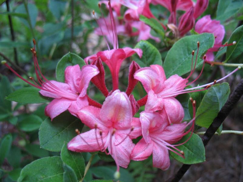 This Swamp Azalea blooms later in the spring than other species. The deciduous shrub displays red buds that open to fragrant, dusky pink flowers. The flowers contrast nicely with handsome blue-green foliage with silver undersides. Grows best in acidic, moist (thus the name "swamp") soil in afternoon shade. Grows 4-5' tall and wide. Hardy to Zone 5.