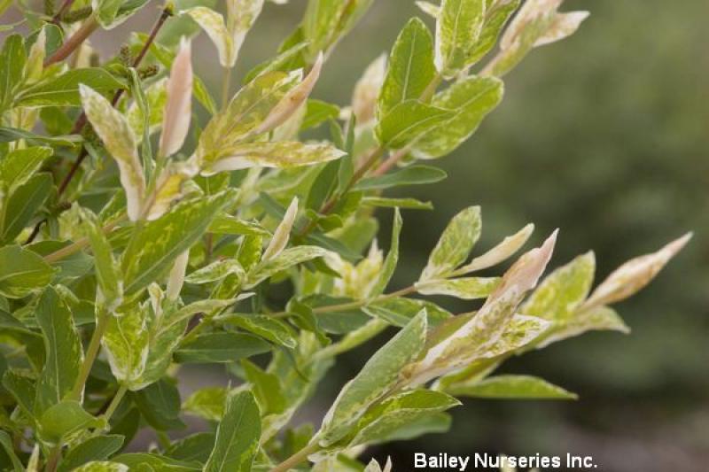This is the rounded, spreading shrub with pink stems, grafted on a 4' standard. Green, pink, and white variegated foliage, with some leaves all white, put on a nice show. Best in part shade to keep the white from burning. May need staked as a young plant until the trunk thickens and strengthens. Prune back young plants in the spring (and perhaps again in the summer) to keep it from becoming top heavy. As a more mature plant, it can be pruned back to look like a light colored lollipop, or allowed to weep and hang down. Grows 9' tall and 6' wide. Hardy to Zone 4.