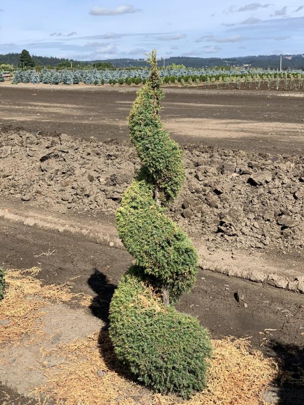 Erect column of vibrant foliage shaped into a spiral topiary. Juniperus 'Gold Cone' foliage emerges yellow and deepens into a copper hue by winter. Full sun is best for optimal coloring and achieving moderate growth rate. Mature size is 3'-5' tall and 1'-2' wide, and pruning in late winter is necessary to keep desired size and shape. It is hardy in Zone 5.