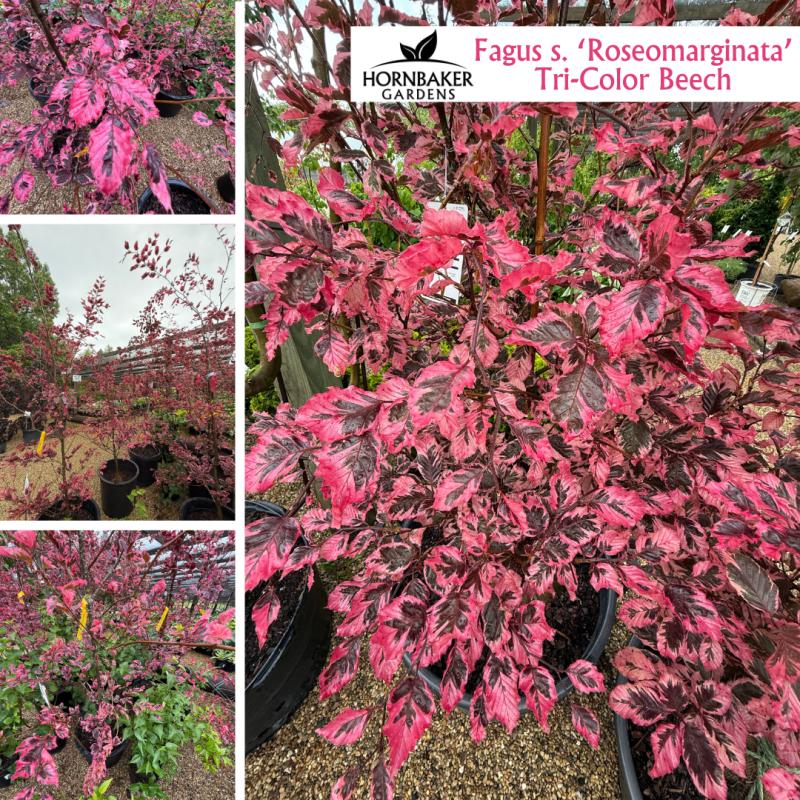 The Tri-Color Beech looks like it's blooming in the spring because the margins of the maroon leaves glow an intense pink. By summer, the leaves have turned to bronzed green with creamy margins. This slow grower, when grown in full sun, develops an oval crown. As an understory tree in some shade, it has an irregular, ornamental habit as it reaches for sunlight. Grows to 45' tall and 30' wide. Hardy to Zone 5.