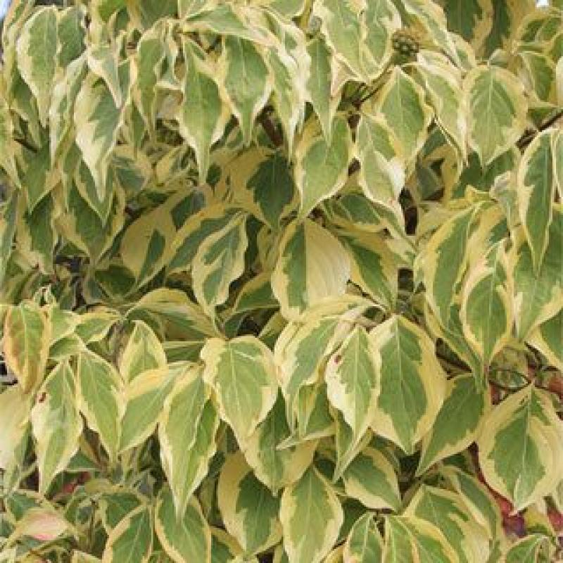 This variegated Kousa Dogwood produces white flower bracts in late spring which complement rich, boldly contrasting green and gold leaves. The foliage turns vivid fall tones of red, orange and pink. Best in afternoon shade, in acidic, moist but well drained soil. It grows 15' tall and wide and is hardy to Zone 5.
