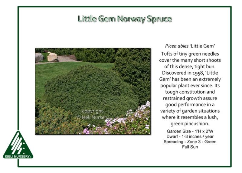 Tufts of tiny green needles cover the many short shoots of this dense, tight bun. Originally a witch’s broom on ‘Nidiformis’ and more ball-like than its parent, Picea abies ‘Little Gem’ was discovered in 1958 and has been an extremely popular plant ever since. Its tough constitution and restrained growth assure good performance in a variety of garden situations where it resembles a lush, green pincushion. Full sun to part shade. Garden size is 1' tall and 2' wide. Hardy to Zone 3.