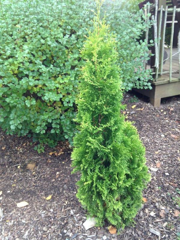'Jantar' is an exciting, brilliant yellow beacon from Poland. The eye popping yellow on this version of Emerald Arborvitae becomes a warmer amber tone during winter, hence the name 'Jantar', Polish for amber. With the same narrow, upright habit as its popular green parent, this selection will add dramatic color to the landscape as a focal plant or privacy screen. Color is best in full sun--more chartreuse in part shade. Garden size is 15' tall and 3' wide. Hardy to Zone 4.