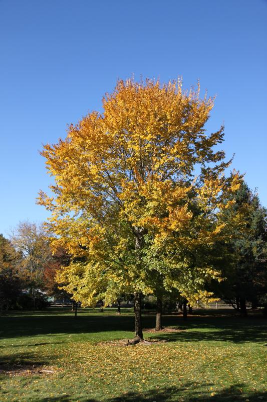(a.k.a. 'Morton Glossy') Remarkably dark green and glossy foliage and a sturdy, symmetrical growth habit distinguish this Morton Arboretum hybrid. It is an excellent, fast-growing shade tree with very good disease resistance. The glossy foliage turns yellow in fall. Grows 50-60' tall and 35-40' wide. Hardy to Zone 4.