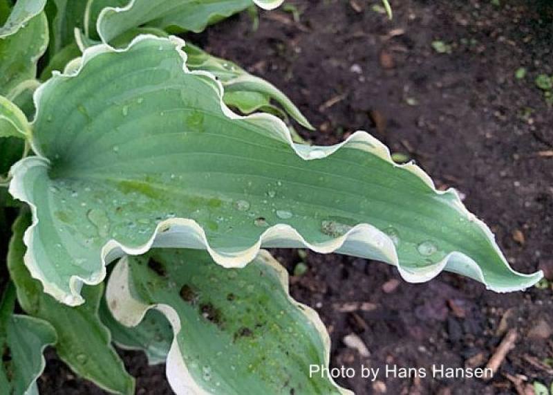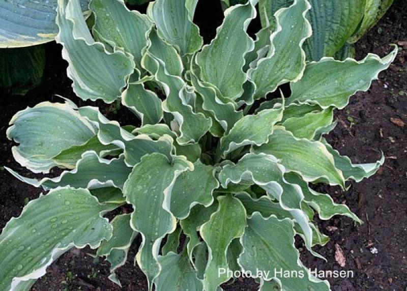 Extremely ruffled leaves give this Hosta the impression of 'dancing' in the shade garden. Leaf edges fold up to display ruffling that extends from the tip of the leaf down the length of the petiole. Leaves are glaucus blue with heavy rippling and wide creamy white margins. Near white flowers are held on proportionate scapes, first appearing in midsummer. Grows 18" tall and 28-32" wide.