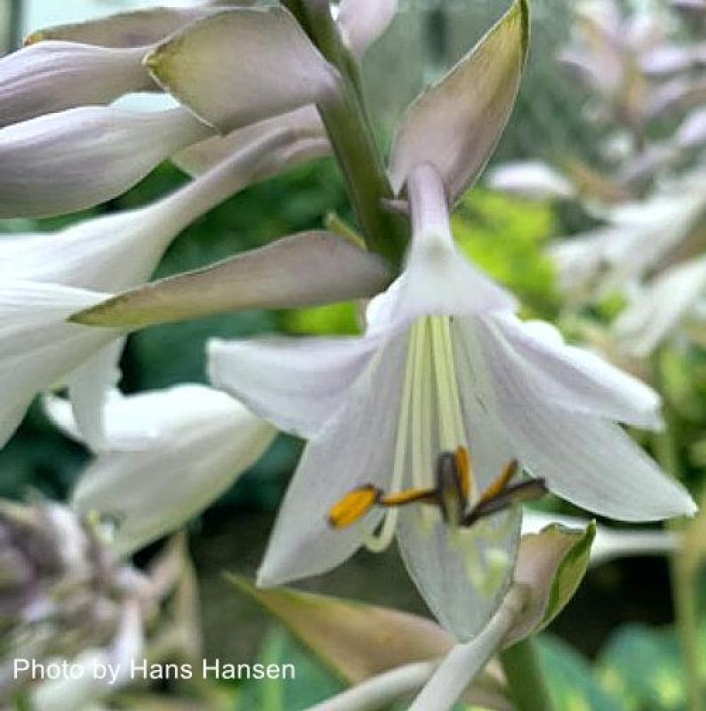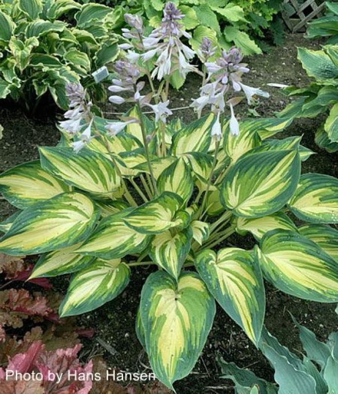 Upright Hosta with cascading tri-colored foliage. Deep blue-green leaves have apple-green jetting around creamy yellow centers. Large white flowers are held on upright proportionate scapes. Begins blooming in early summer. Grows 17" tall and 36-40" wide.