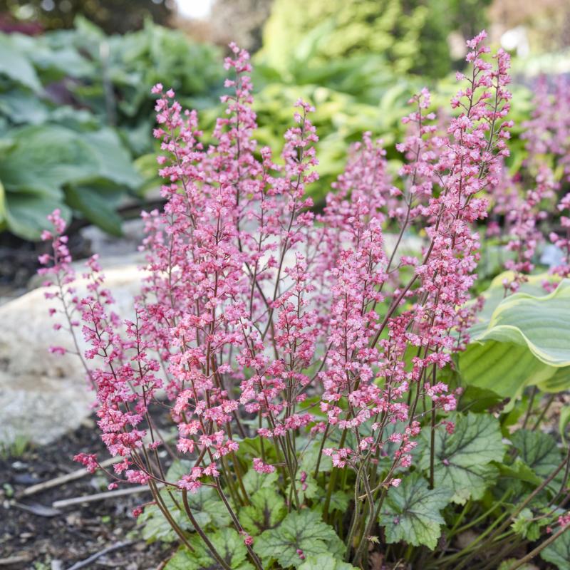 Use this Heucherella to color up shadowy spaces in your garden! Green leaves have a silvery overlay. Dark burgundy centers radiate out along the veins of the leaves. In late spring sprays of bubblegum pink flowers mound above the foliage. Flower scape heights are proportionate to the size of the plant. Leaf color stays rich through the end of the season. Semi-evergreen in more temperate climates. The clump of foliage grows 10-12" tall with a spread of 15-18". Plant in full to part shade. Hardy to Zone 4.