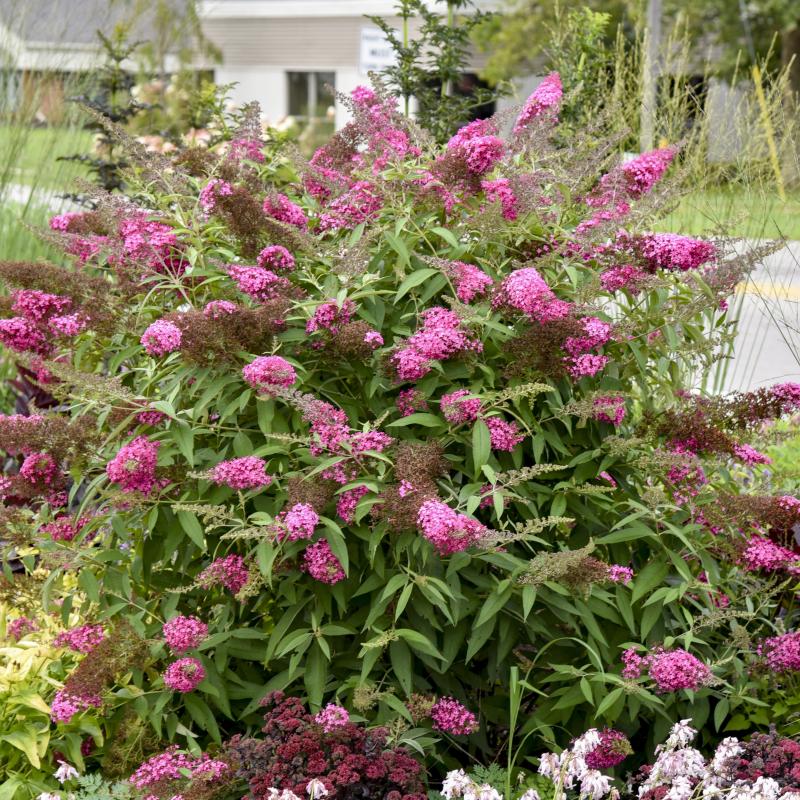 An exceptionally floriferous, full Butterfly Bush. Flower panicles are notable wide and long, measuring more than 8" in length while in peak bloom. Individual flowers are a bright rose pink color. Excellent heat and drought tolerance when established. Popular with pollinators; an excellent food source for butterflies.