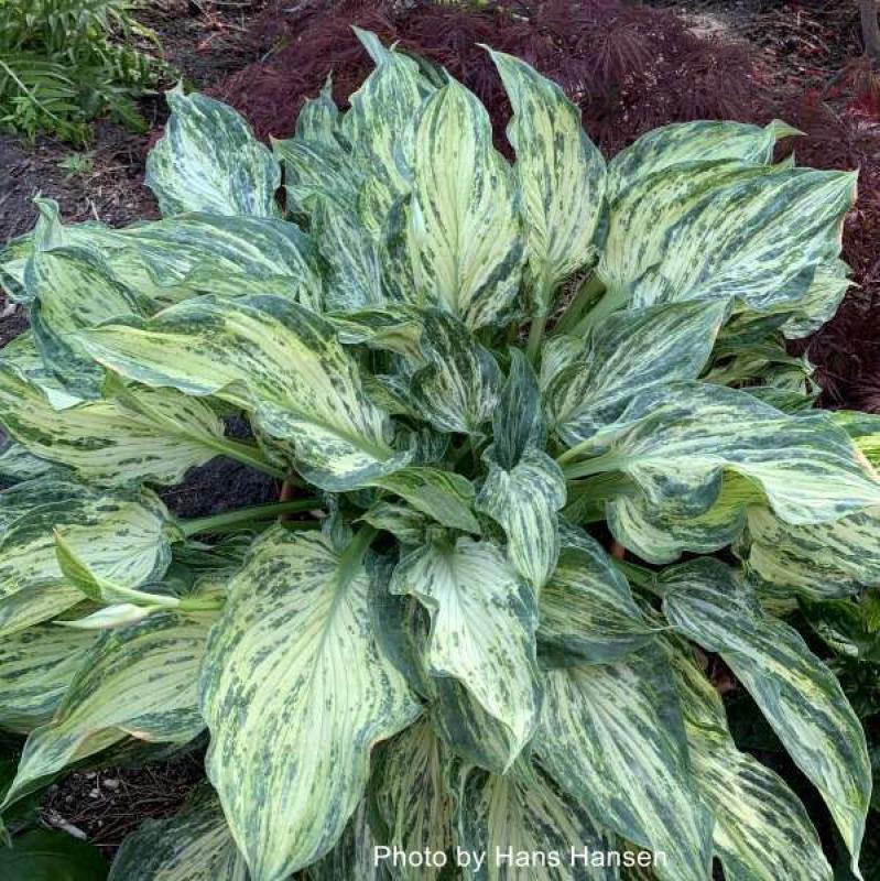An incredible sport of 'Empress Wu'. Unusual flecking adorns each leaf. Leaves are the most white in spring, with flecks growing in size and number as the season progresses. Near white flowers appear in early summer. Much more compact than 'Empress Wu', growing 21" tall and 42" wide.