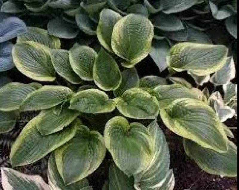 A huge clump of green leaves with soft yellow margins in spring, turning to soft white in summer. The leaves are slightly wavy, slightly corrugated and slightly shiny. Pale lavender flowers appear in July on scapes reaching 4' or more.